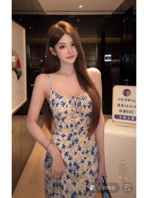 ブルーのフラワープリントがエレガントなスリムワンピース