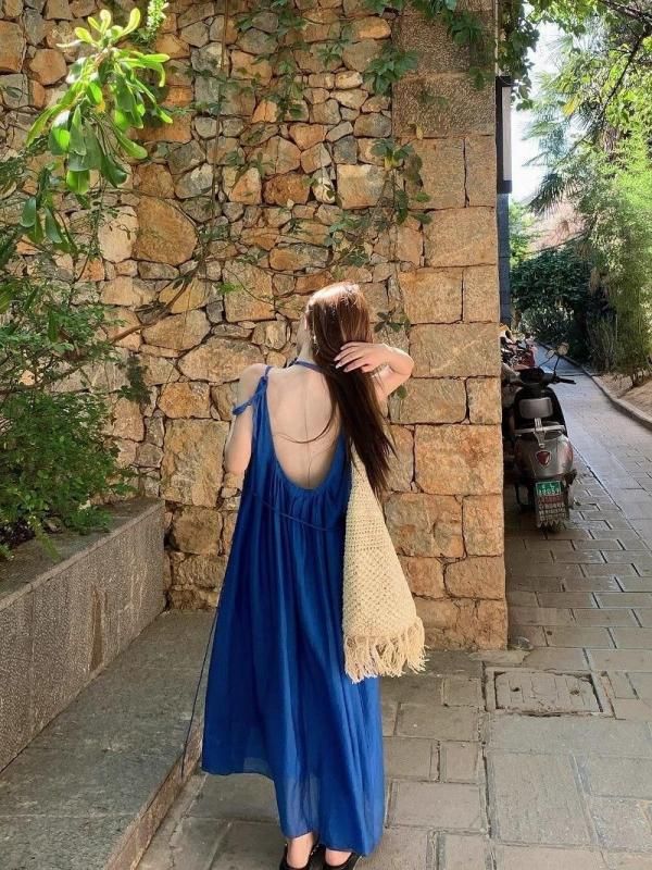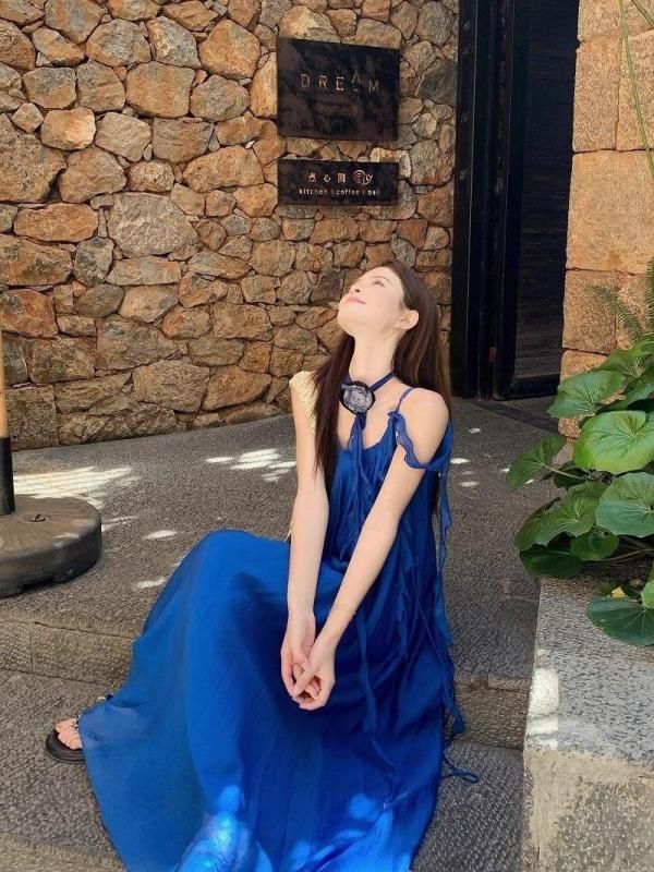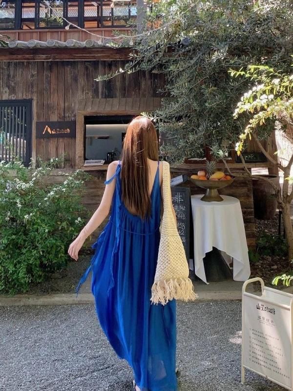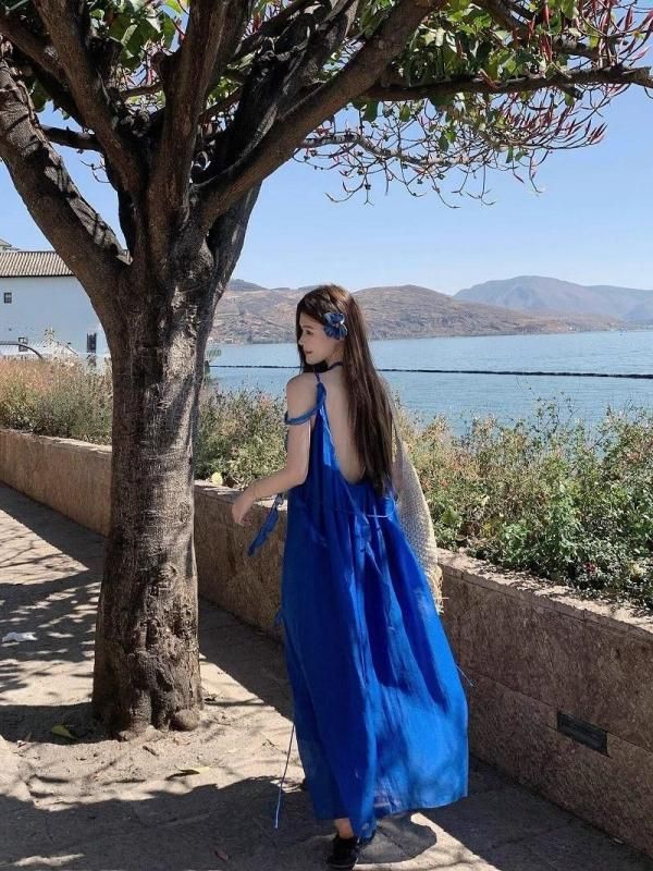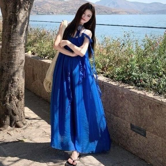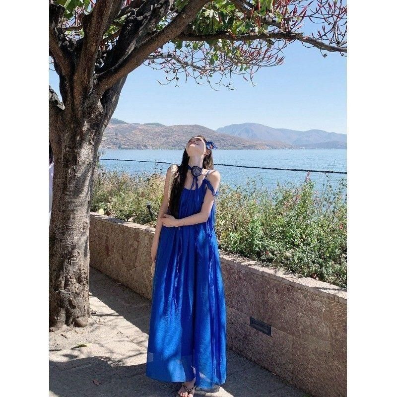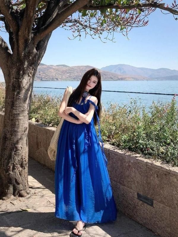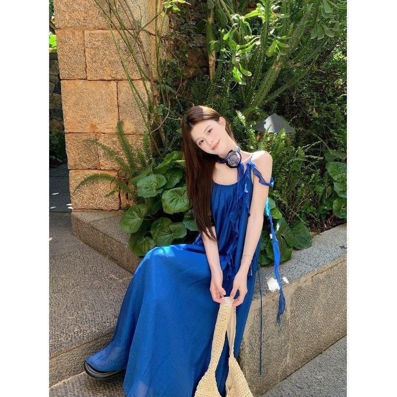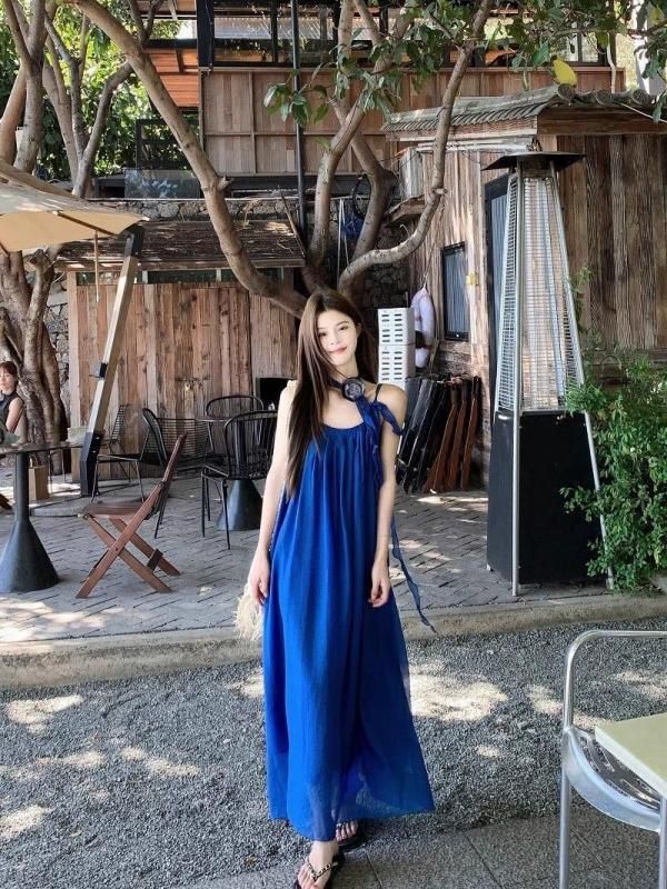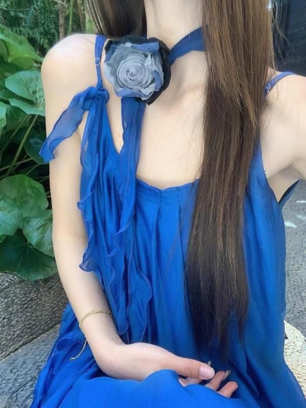 フラワーコサージュがおしゃれなロングワンピース 青