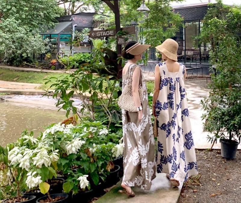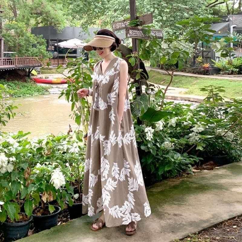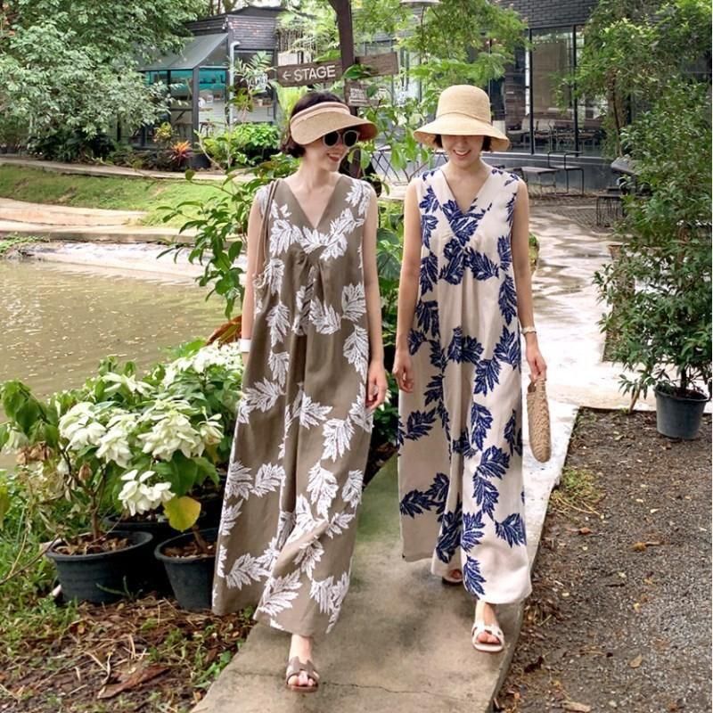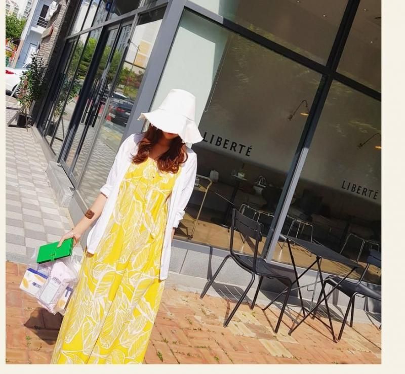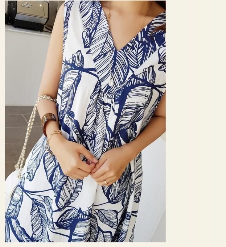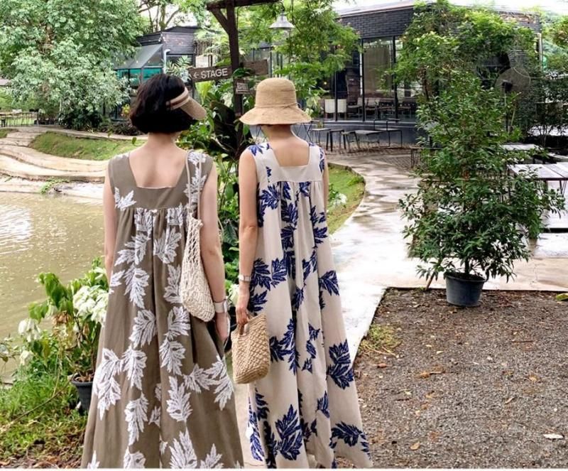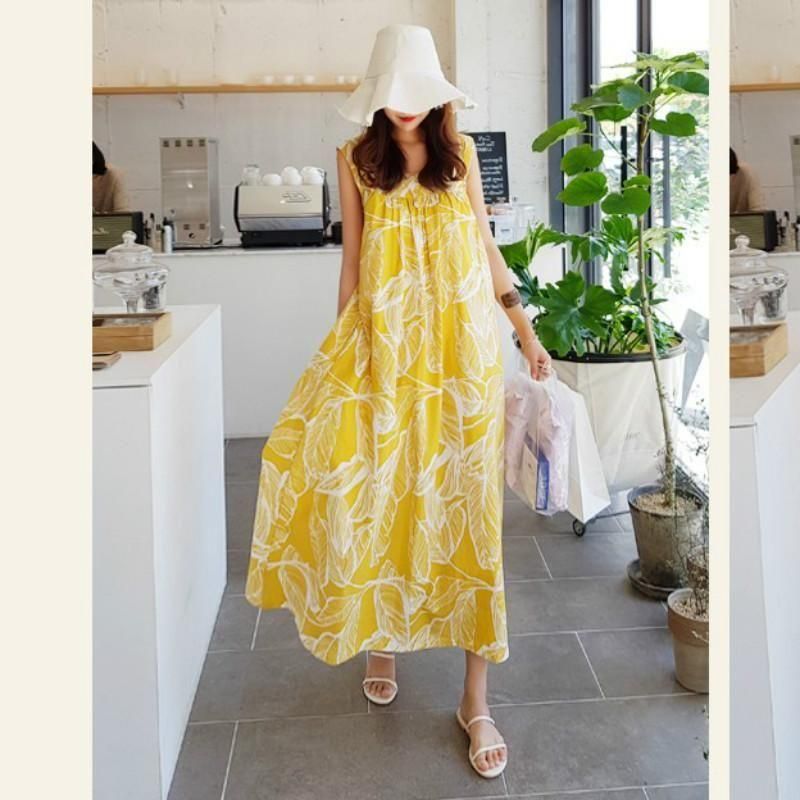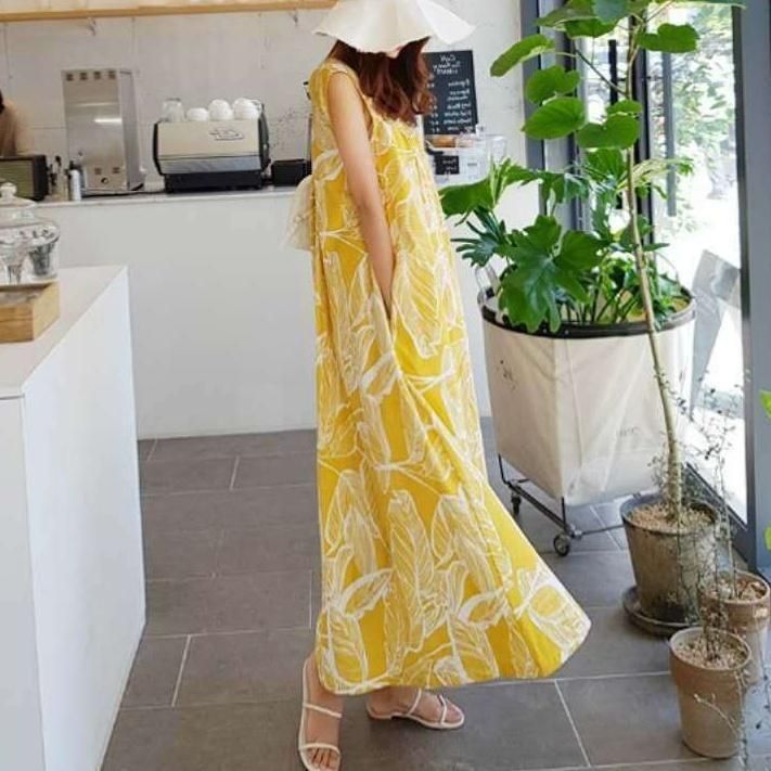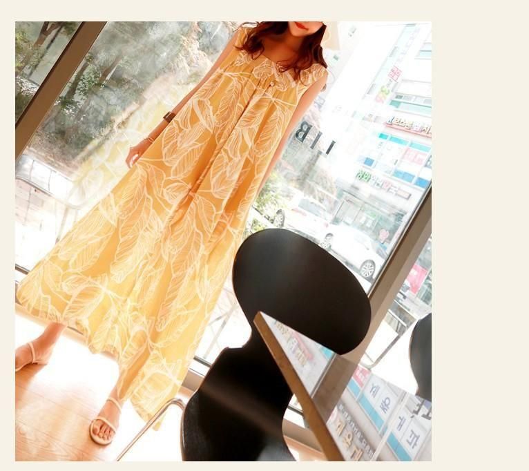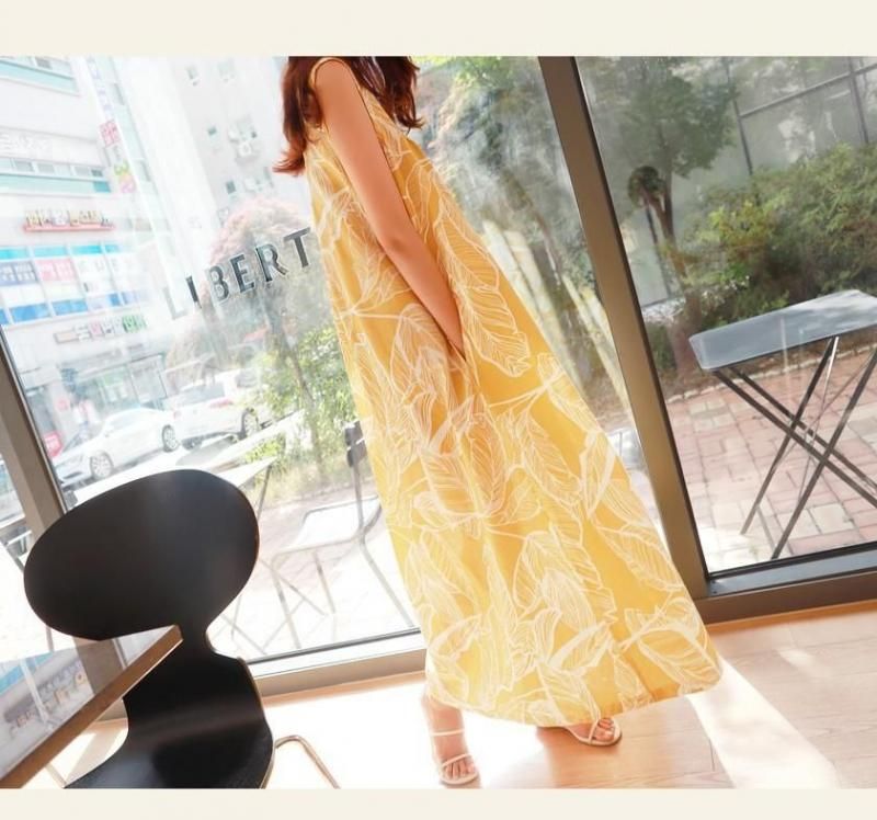 アートなリーフプリントがおしゃれなロングワンピース 黄 青 ベージュ
