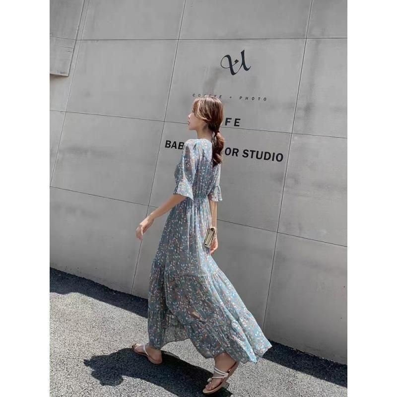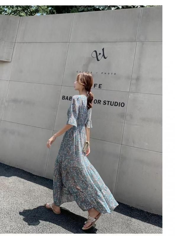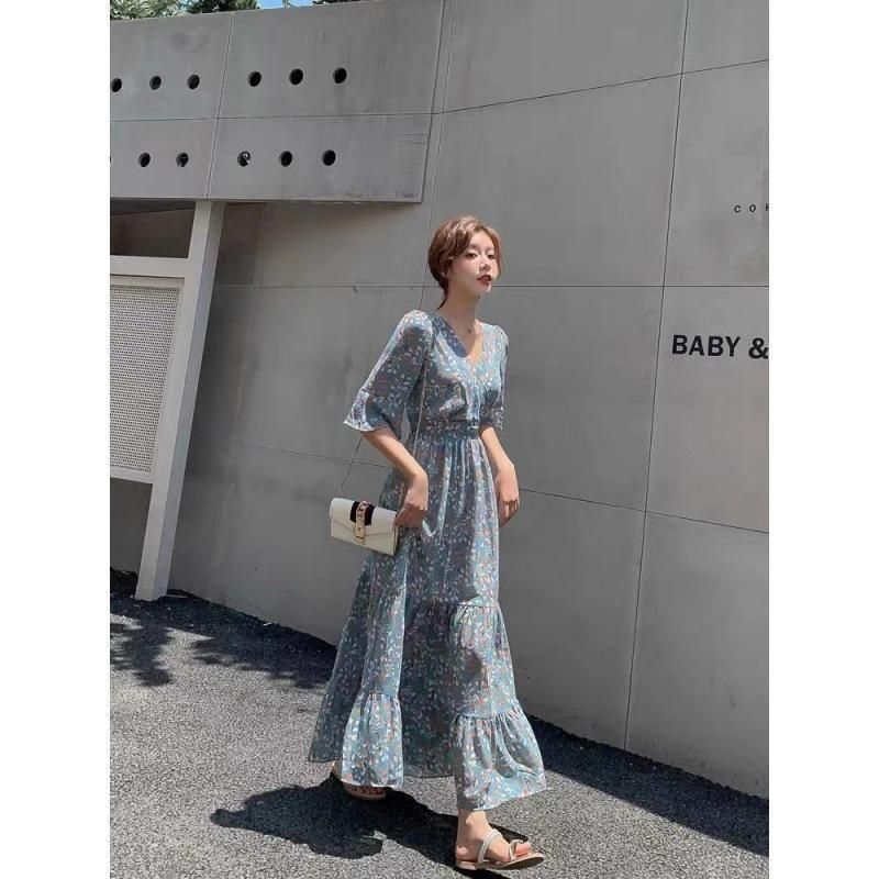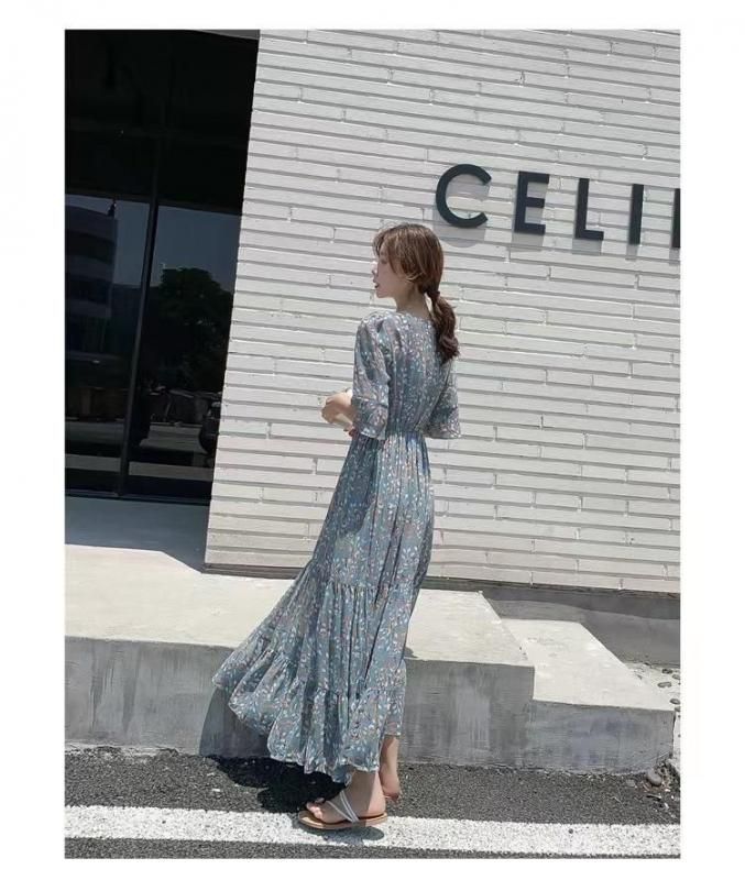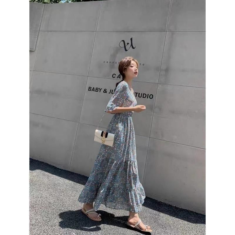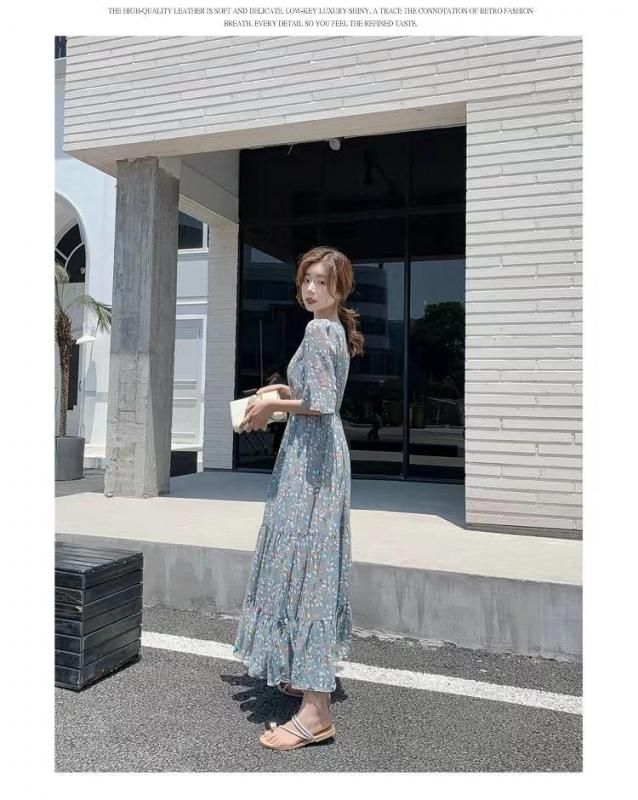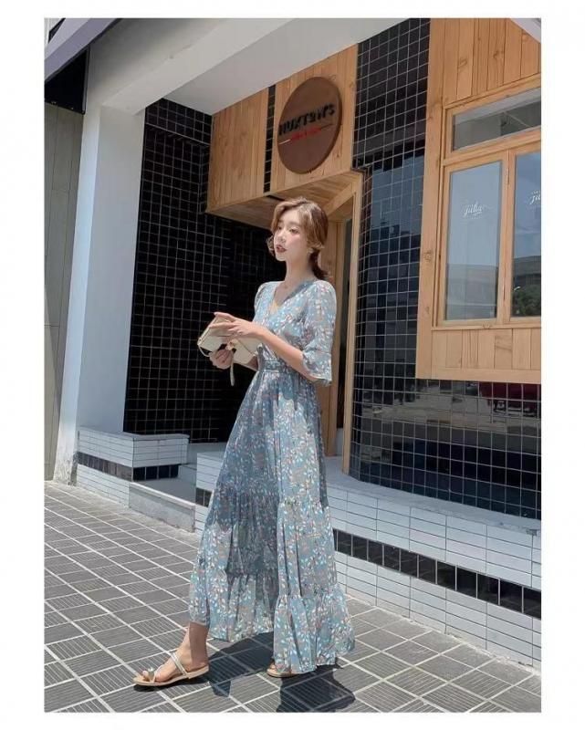 パステルブルー×小花柄が上品なロングワンピース