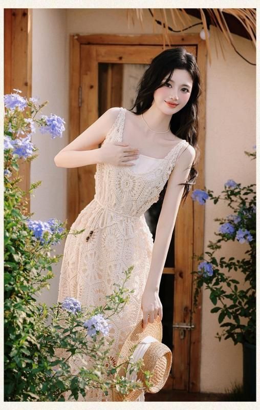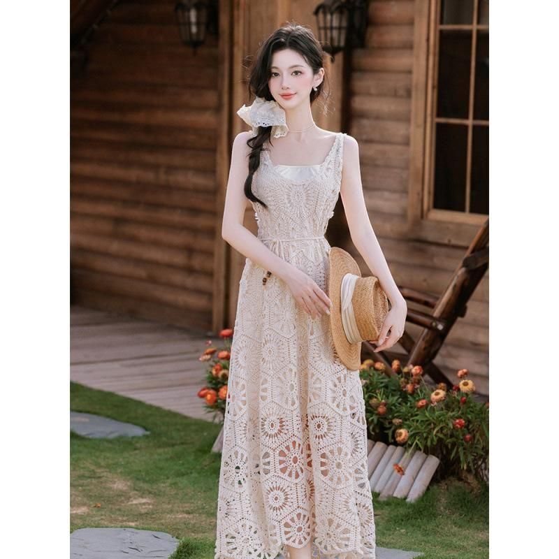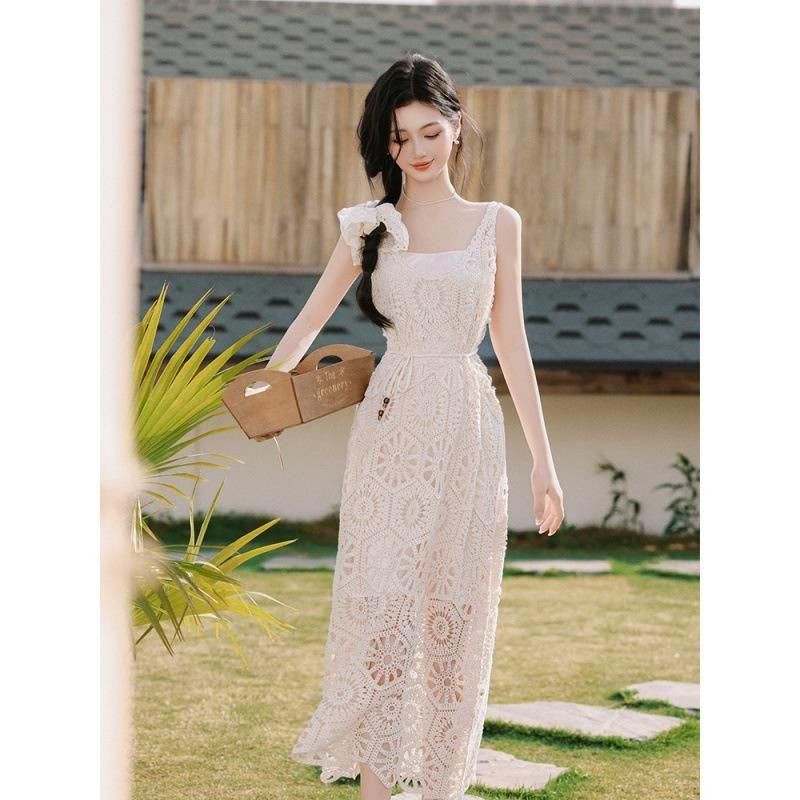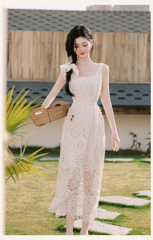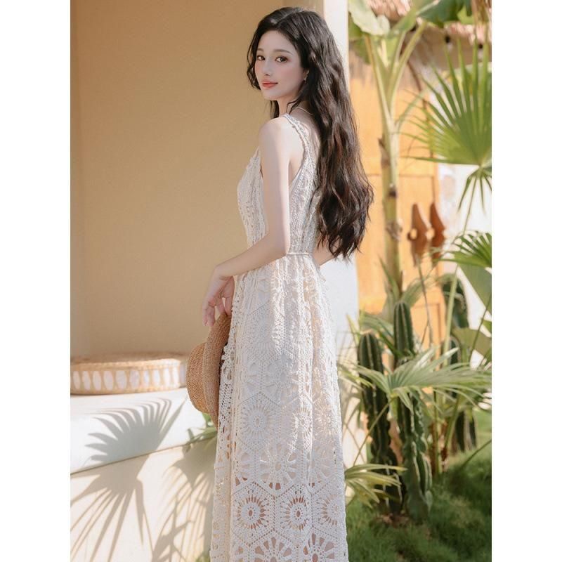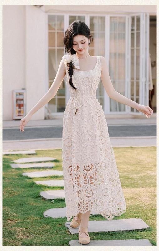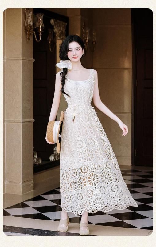 フレンチシックなクロシェがおしゃれなロングワンピース 白