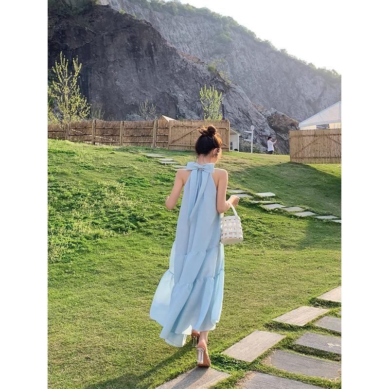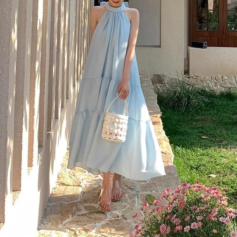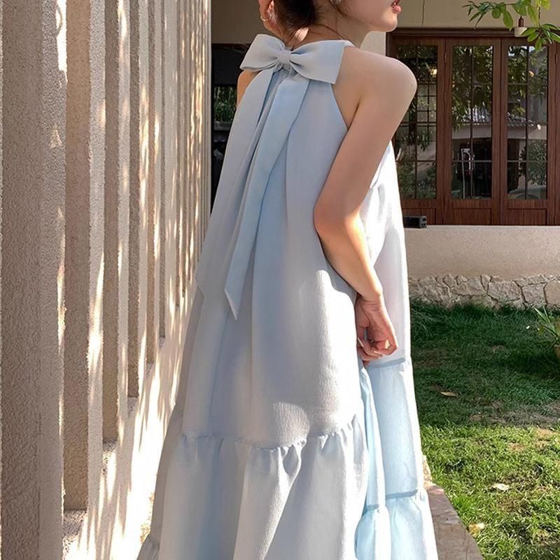 バックリボンがおしゃれなホルターネックワンピース 白 青